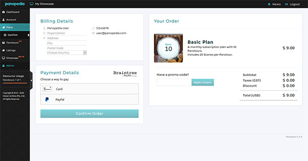 To purchase a subscription plan, log in and navigate to Plans, or https://mail.sandbox.panopedia.com/account/plans.