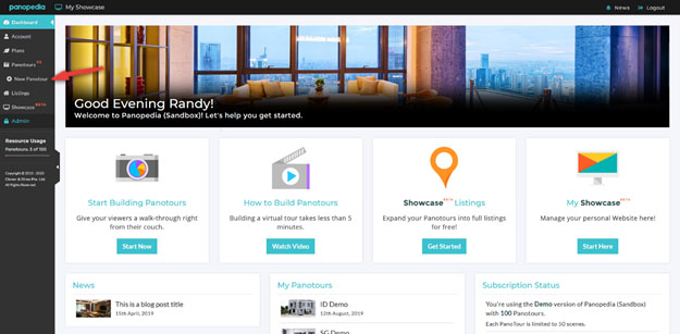 To create a Panotour, you have to login to your dashboard, and click on New Panotour on the navigational menu, or https://mail.sandbox.panopedia.com/account/pano/create.