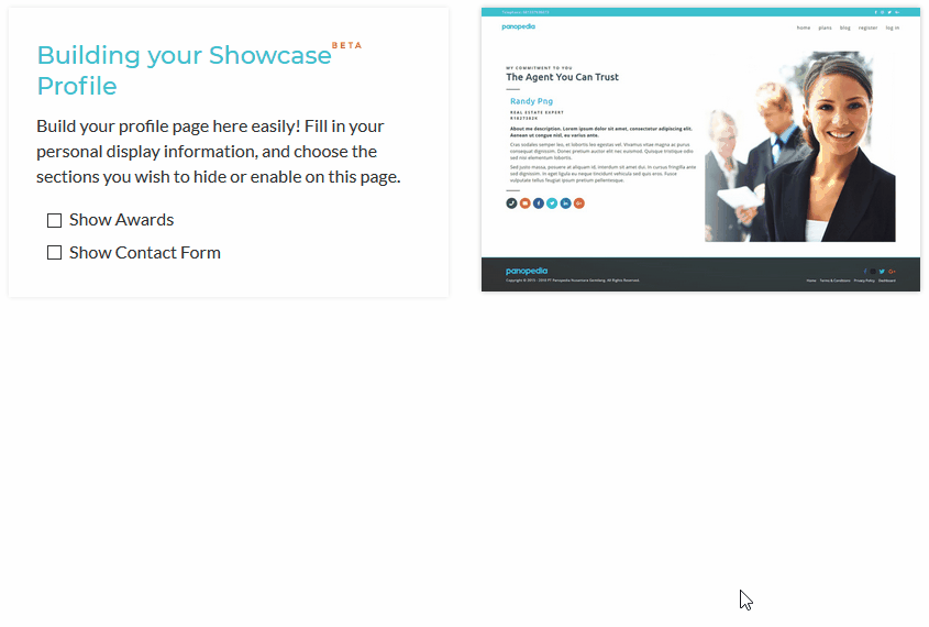To build your profile, log in and navigate to Showcase Profile, or https://mail.sandbox.panopedia.com/account/showcase/profile.